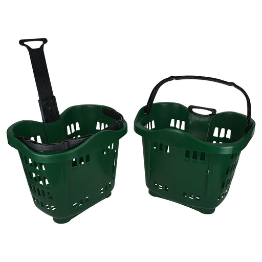 A basket with an extending handle and wheels that can be towed by the customer. When at the till the tow handle collapses and the basket can be lif...
